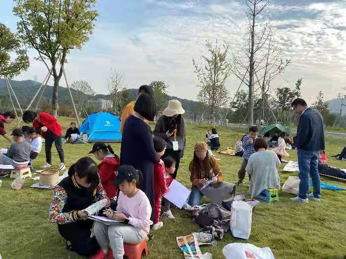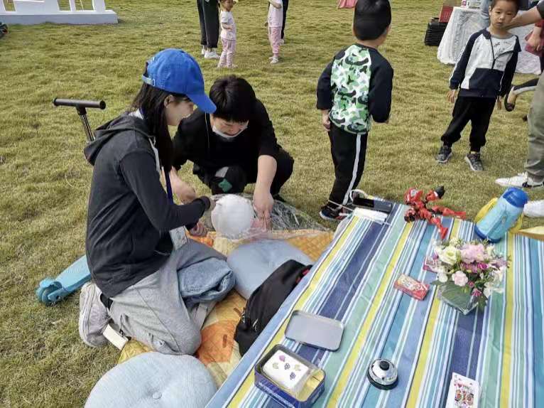 黄华竹:这一天天气很好,帮忙做了一些小事后,便观察了起来。在指引客户的时候,发现很多来公园游玩的人被吸引过来,但是因为缺乏指引和参与感,匆匆游览一遍就离开。那天最受欢迎的大概是制作棉花糖的小摊,常常看到很多小朋友拿着棉花糖溜达,很多小姐姐也被勾起了童心,围在小摊周围等待购买。午后,我们坐在野餐垫上,吃着零食,听着音乐,天空湛蓝,几许闲云,从萧山出发的飞机时不时从上方略过,莫名就生出时光静好的感动来。