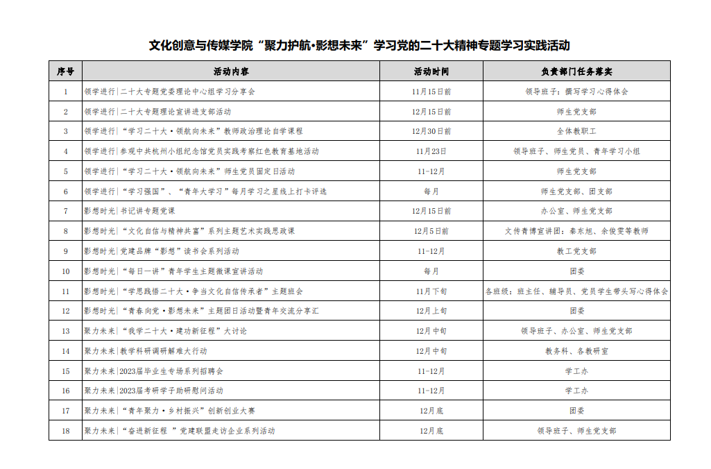 事事调研解难,人人争先践行。围绕党的二十大精神,结合浙江、杭州的丰富实践成果,充分发挥文传学院艺术文化学科优势,紧扣“乡村共富”主题,进行系统深入地研究、阐释、解读,加强理论研究与调查研究相结合,聚焦党的二十大提出的新思想、新观点、新论断,邀请一批高水平专家深入展开阐释研讨活动,加强学术平台建设,召开座谈会,发表理论文章,组织申报一批思政课题研究,开展提升党建工作质量专题大讨论,做强做优做大“影想”党建品牌建设。聚焦新使命、新任务,以师生党支部为单位,针对师生关注的热点难点问题深入开展教学科研水平调查研究,聚力攻坚为师生解决实际困难。针对高校学生就业难问题,举办好2023届毕业生专场系列招聘会、2023届考研学子助研慰问活动、“青年聚力·乡村振兴”创新创业大赛、“奋进新征程·访企拓岗 ”党建联盟走访企业系列活动。进一步激励师生比学赶超,推动学习实践活动走实走深,将学习宣传贯彻党的二十大精神转化为推动教书育人、学术科研、服务地方等各方面工作高质量发展的强大动力,贡献师大文传智慧。