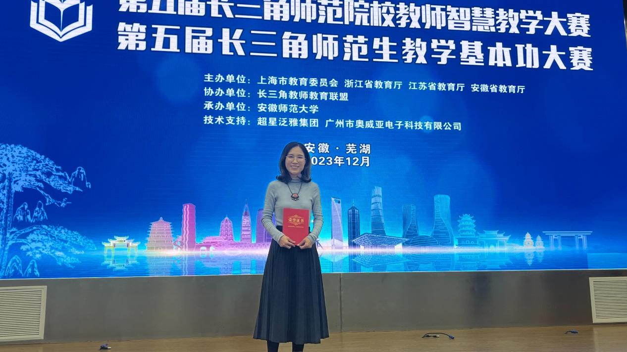 本次大赛由安徽省教育厅、上海市教育委员会、浙江省教育厅、江苏省教育厅联合举办,分人文社科组、理工组、艺术组和体育组四个组别。来自长三角地区51所高校300名师生参加了比赛经过省赛选拔和长三角师范院校现场赛,陈帆帆老师凭借其优秀的教学技能和对智慧教学的良好把握,脱颖而出,赢得了评委们的一致好评。