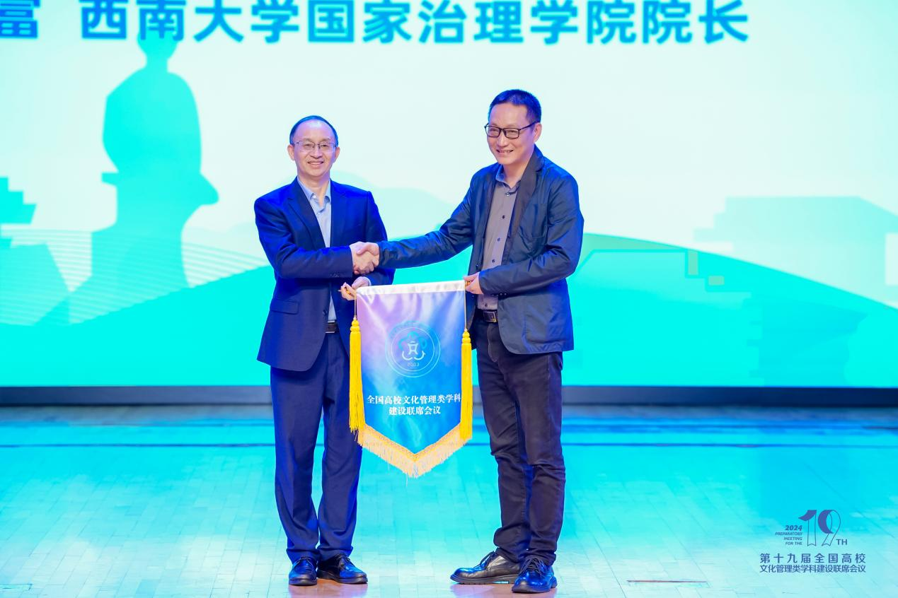 会议闭幕式由我校色情小说 党委书记陈勋主持。中国文化产业协会秘书长金鹏宣读了中国文化产业协会学科建设专委会成立文件及学科建设专委会聘任名单。范周、金鹏共同为专委会揭牌。大会为专委会受聘专家颁发了聘书。范周对本届联席会议做总结,他强调本次会议聚焦时代需求,展示了我国文化管理类学科的最新研究成果,为文化管理类学科体系建设指明了方向。范小春向西南大学国家治理学院院长潘孝富交接了会旗。潘孝富院长代表下一届承办单位致辞,邀请各位专家学者齐聚重庆,继续碰撞出新的智慧火花。