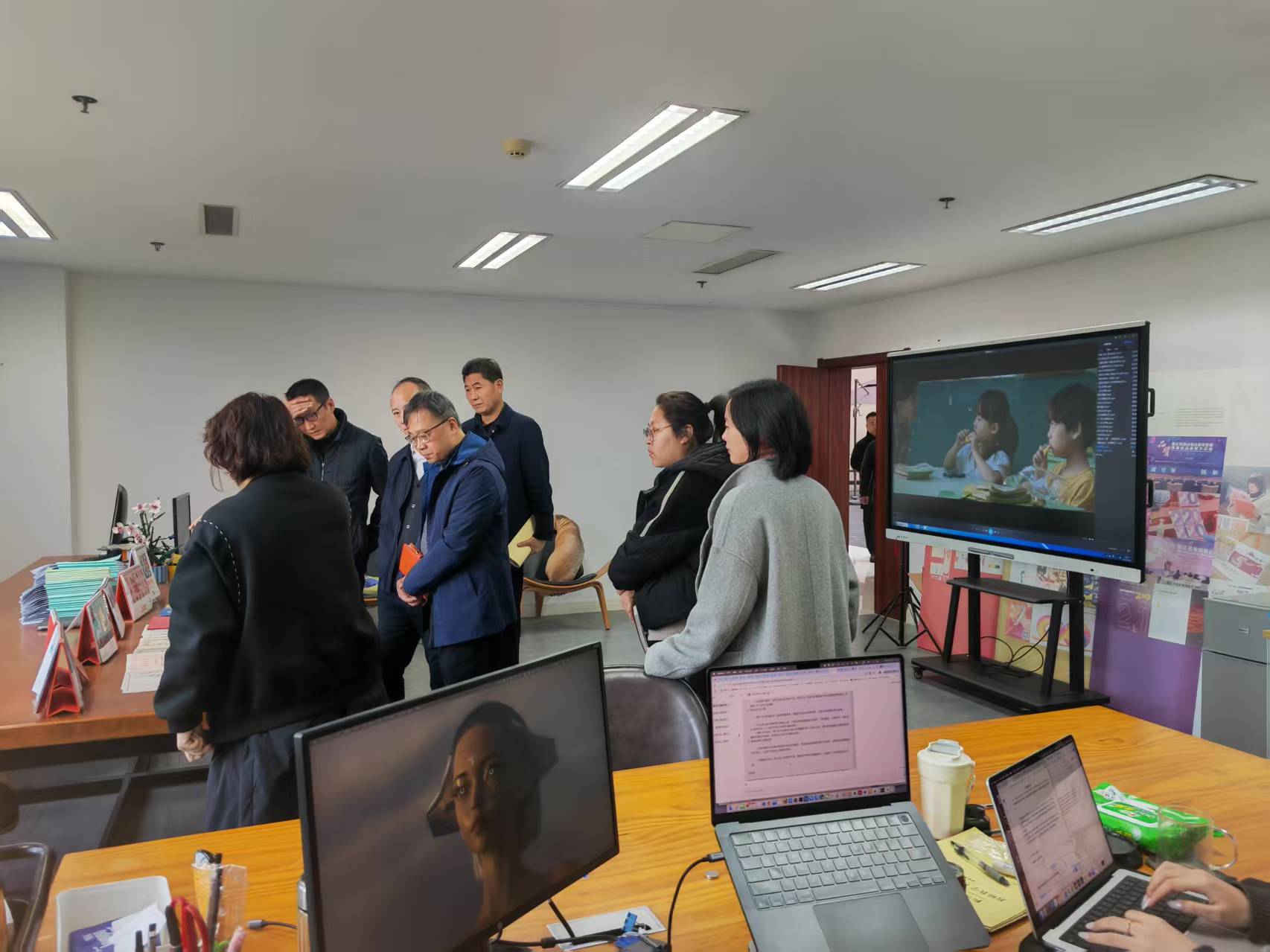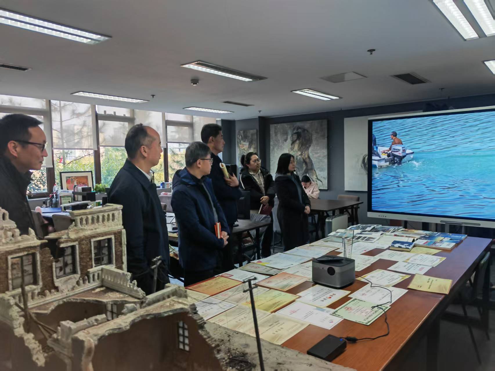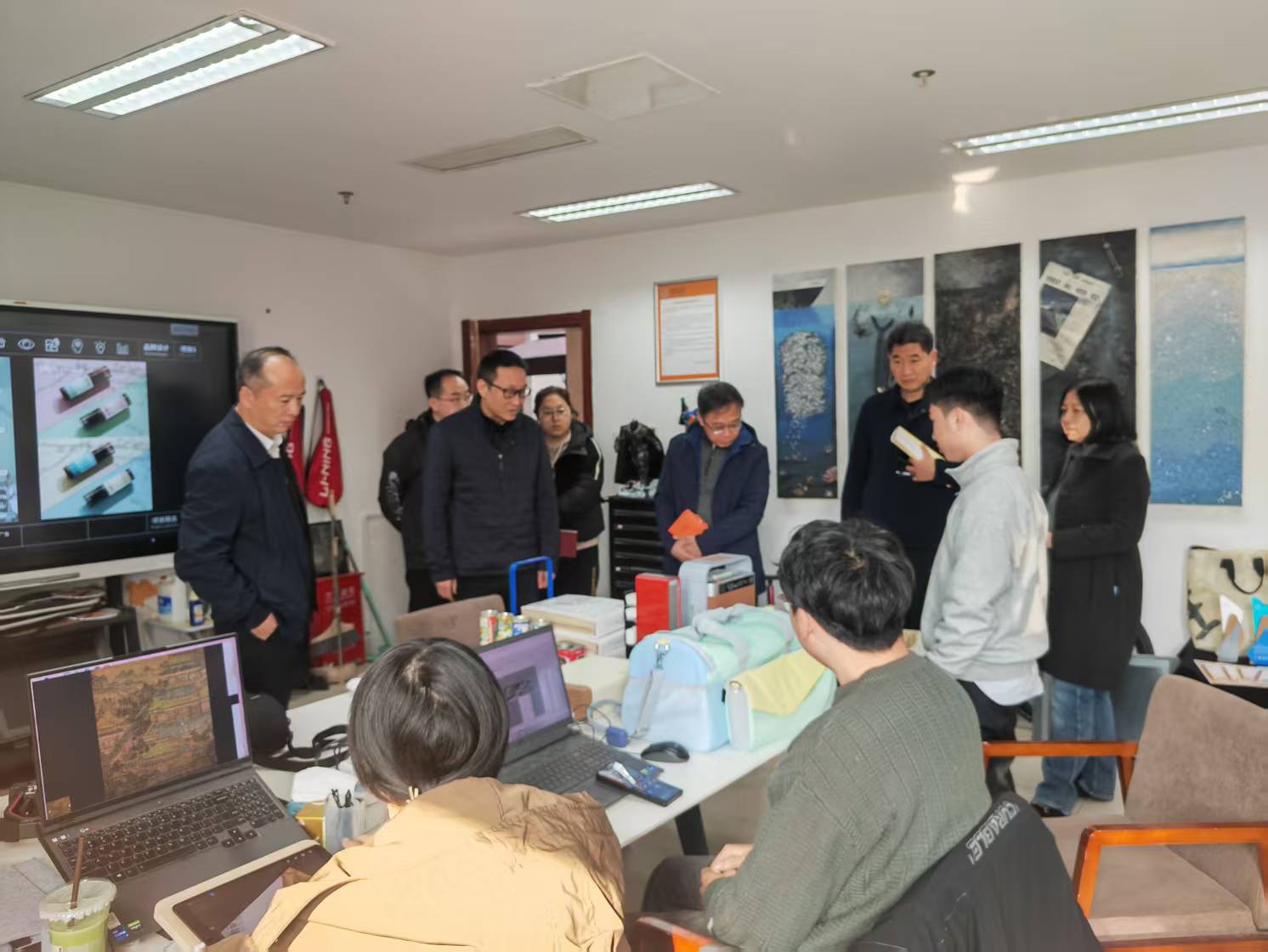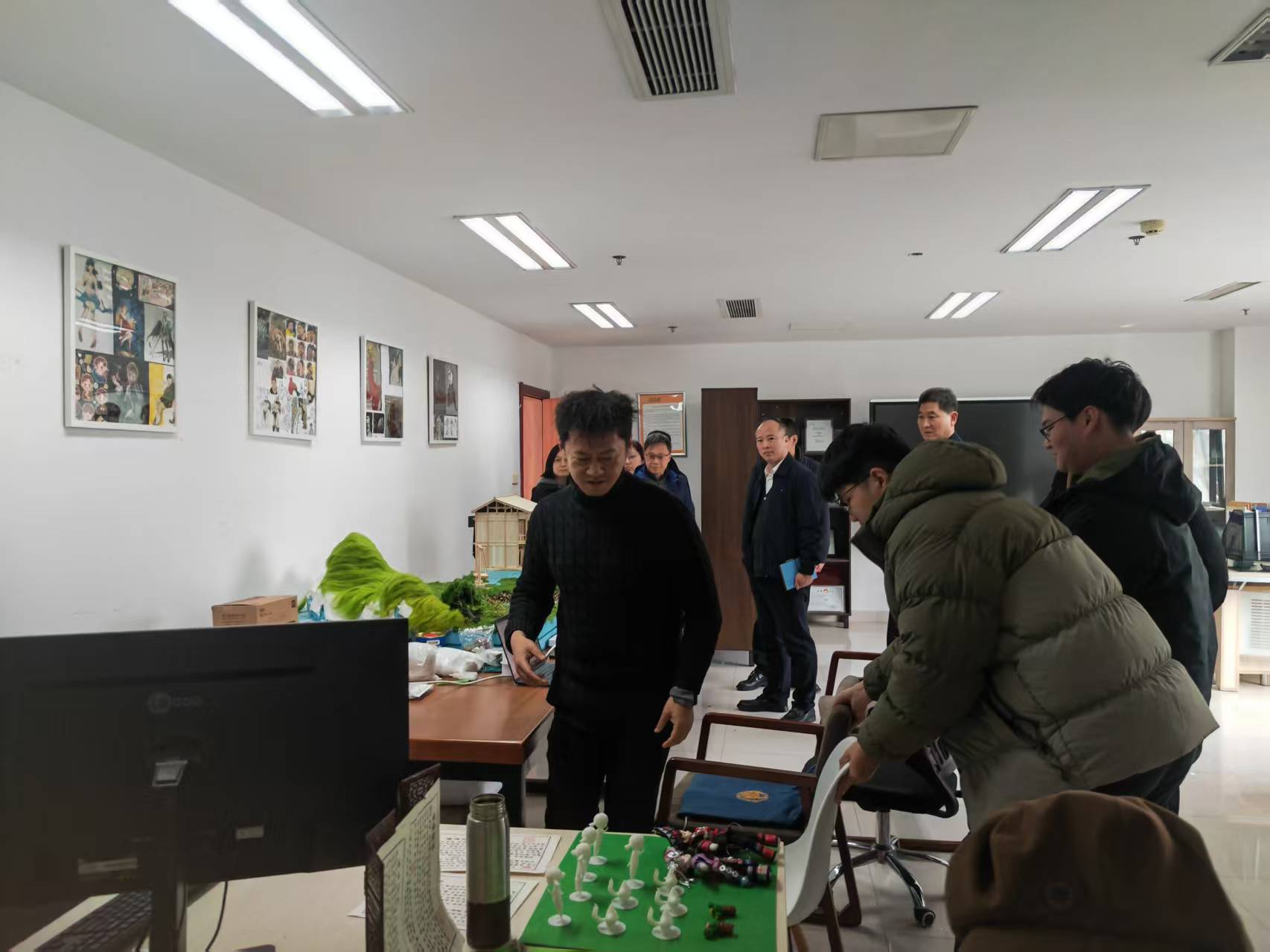 活动首先参观了学院研创中心呈现的动画设计类、文创设计类、动漫设计类、产品设计类、影视短视频类与公益广告相关的作品。随后院长范小春介绍了学院目前发展建设与师资现状情况。华数集团党委委员王明华从杭州文创之都和ai背下结合公益特色如何合作创作各类公益广告作品,如何推送宣发渠道,提出具体想法。杭州市文明办副主任丁向崧从成立创作联盟单位,以及如何从公益广告传播学术上理论研究提供支持,结合师生创作成立合作基地,让高校的公益广告研究和创作通过合作去市场检验几个方面提出合作的想法和思路。