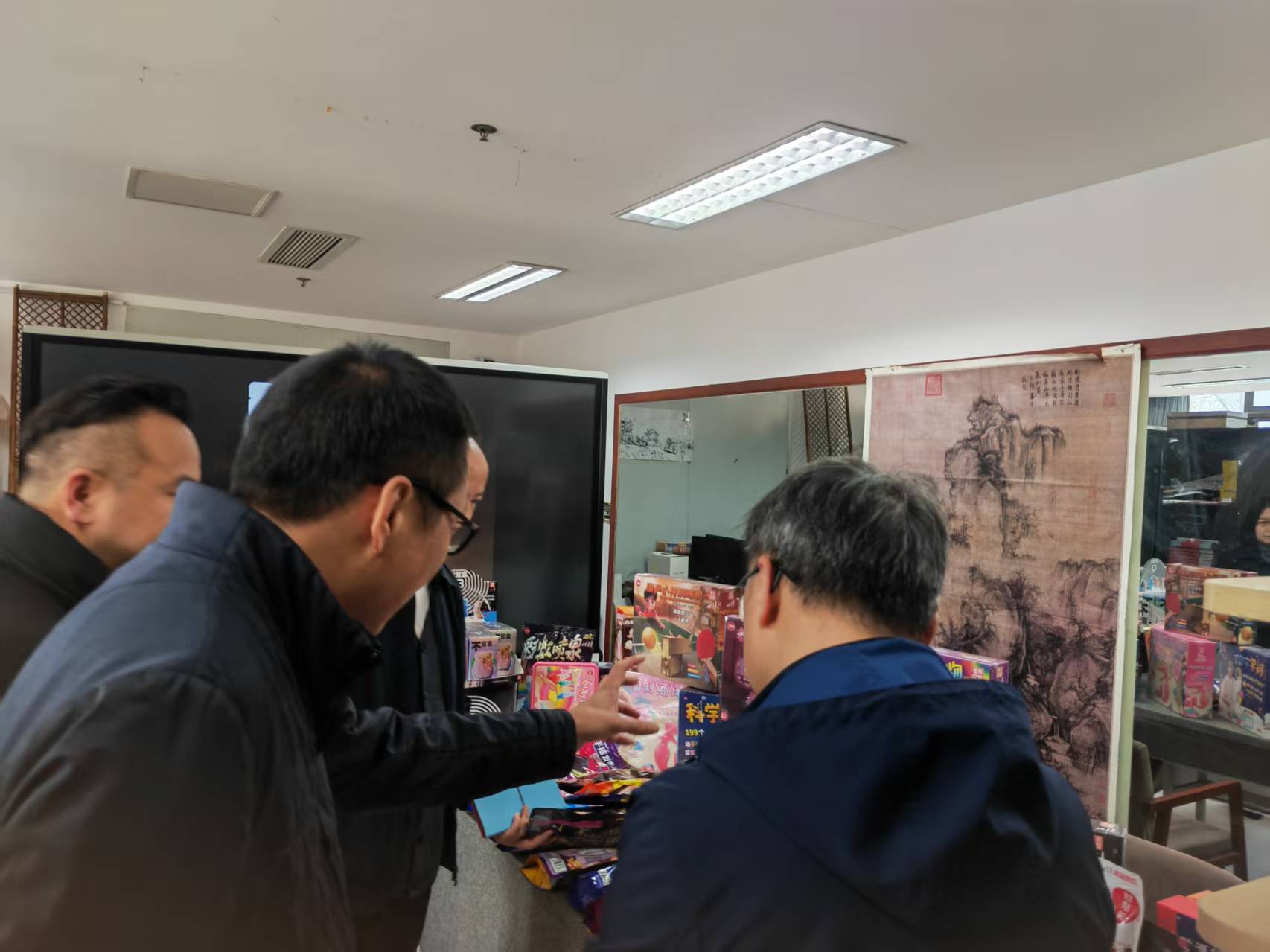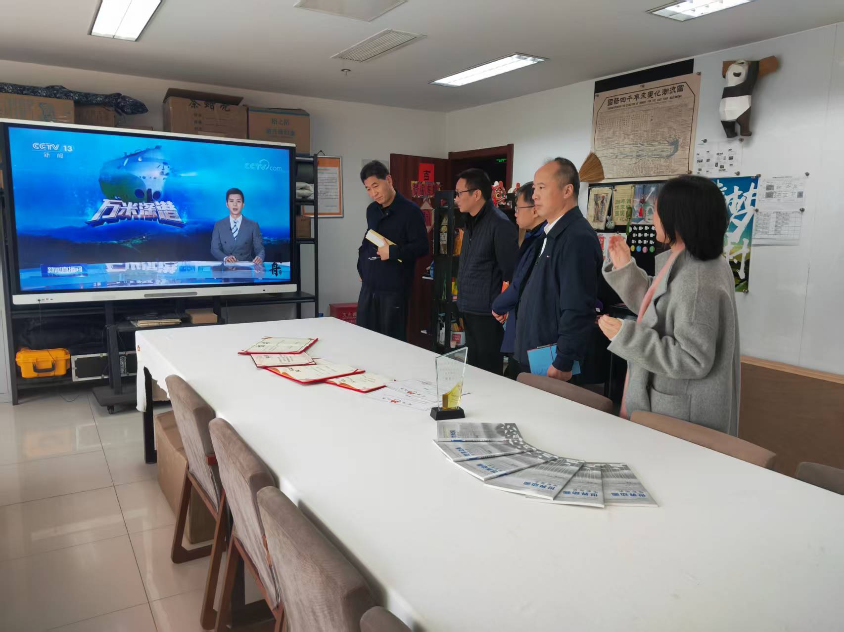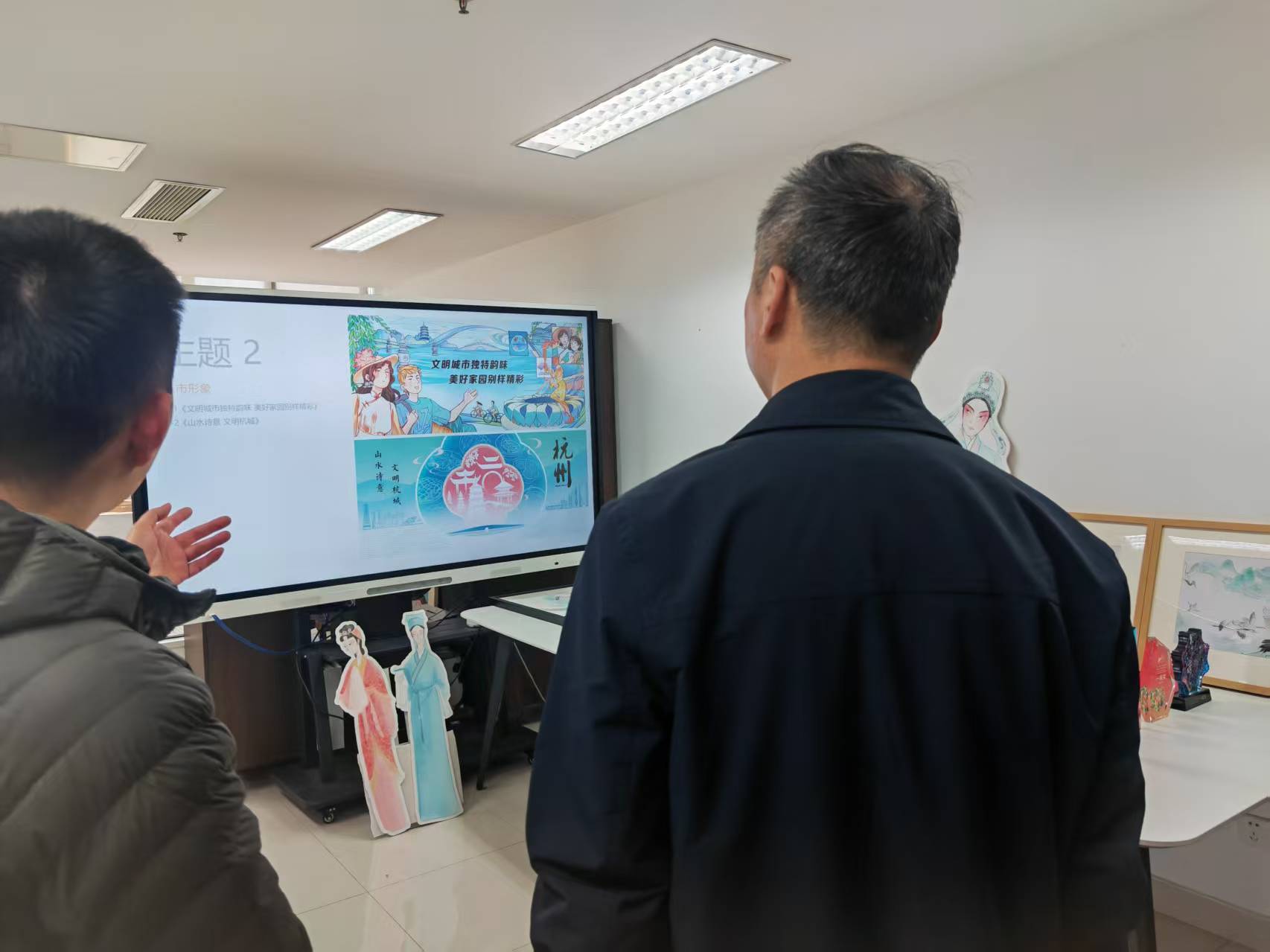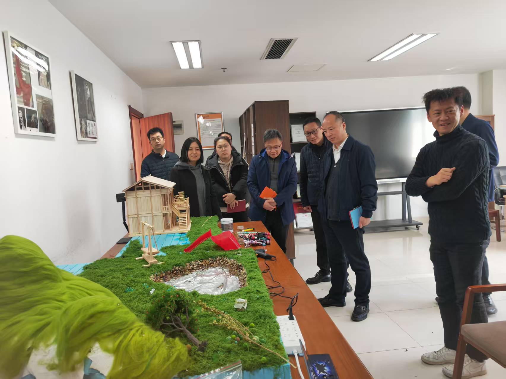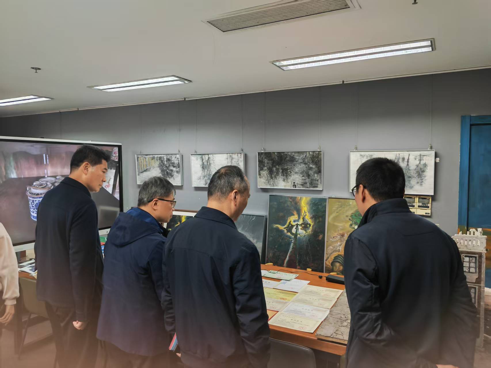 活动首先参观了学院研创中心呈现的动画设计类、文创设计类、动漫设计类、产品设计类、影视短视频类与公益广告相关的作品。随后院长范小春介绍了学院目前发展建设与师资现状情况。华数集团党委委员王明华从杭州文创之都和ai背下结合公益特色如何合作创作各类公益广告作品,如何推送宣发渠道,提出具体想法。杭州市文明办副主任丁向崧从成立创作联盟单位,以及如何从公益广告传播学术上理论研究提供支持,结合师生创作成立合作基地,让高校的公益广告研究和创作通过合作去市场检验几个方面提出合作的想法和思路。