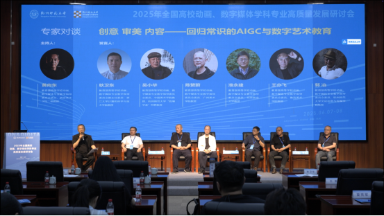 论坛深度聚焦教育链与产业链衔接,推动校企共建“三位一体”育人机制。下午的圆桌论坛分为“专家对谈”与“行业对话”两场,其中“专家对谈”由教育部高等学校动画、数字媒体专业教学指导委员会委员、西安美术学院黄向东教授主持,邀请了六位教育部高等学校动画、数字媒体专业教学指导委员会委员浙江大学耿卫东教授、中国美术学院吴小华教授、广州美术学院陈赞蔚教授、北京林业大学淮永建教授、鲁迅美术学院王亦飞教授、色情小说 郭冶教授,他们围绕“创意、审美、内容——回归常识的AIGC与数字艺术教育”展开对话并形成了共识讨论反思了AI生成作品的评估标准、学生就业方向等现实问题,提出以“人机共生”理念推动学科与产业的双向突破,呼吁教育回归人文内核,避免技术异化创作。