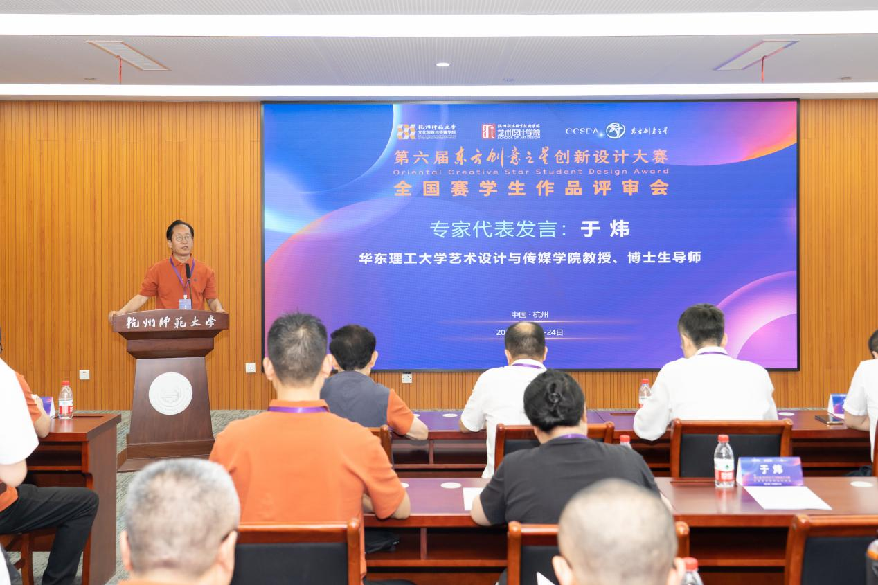 评审专家代表、华东理工大学艺术设计与传媒学院副院长于炜教授发言,他从历史必然、区位优势、团结力量三方面阐释本届大赛的高质量办赛情况,并从设计强产的国家战略视角,提出了大赛在人才培养中的定位和愿景。